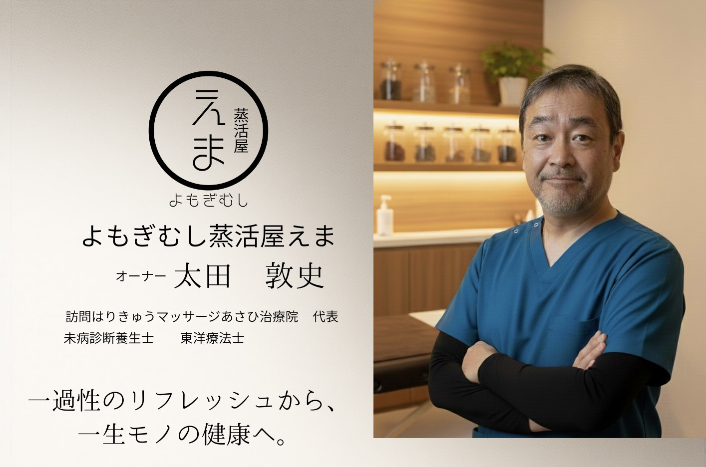 はじめまして。よもぎむし蒸活屋えまオーナーの太田敦史(おおたあつし)と申します。